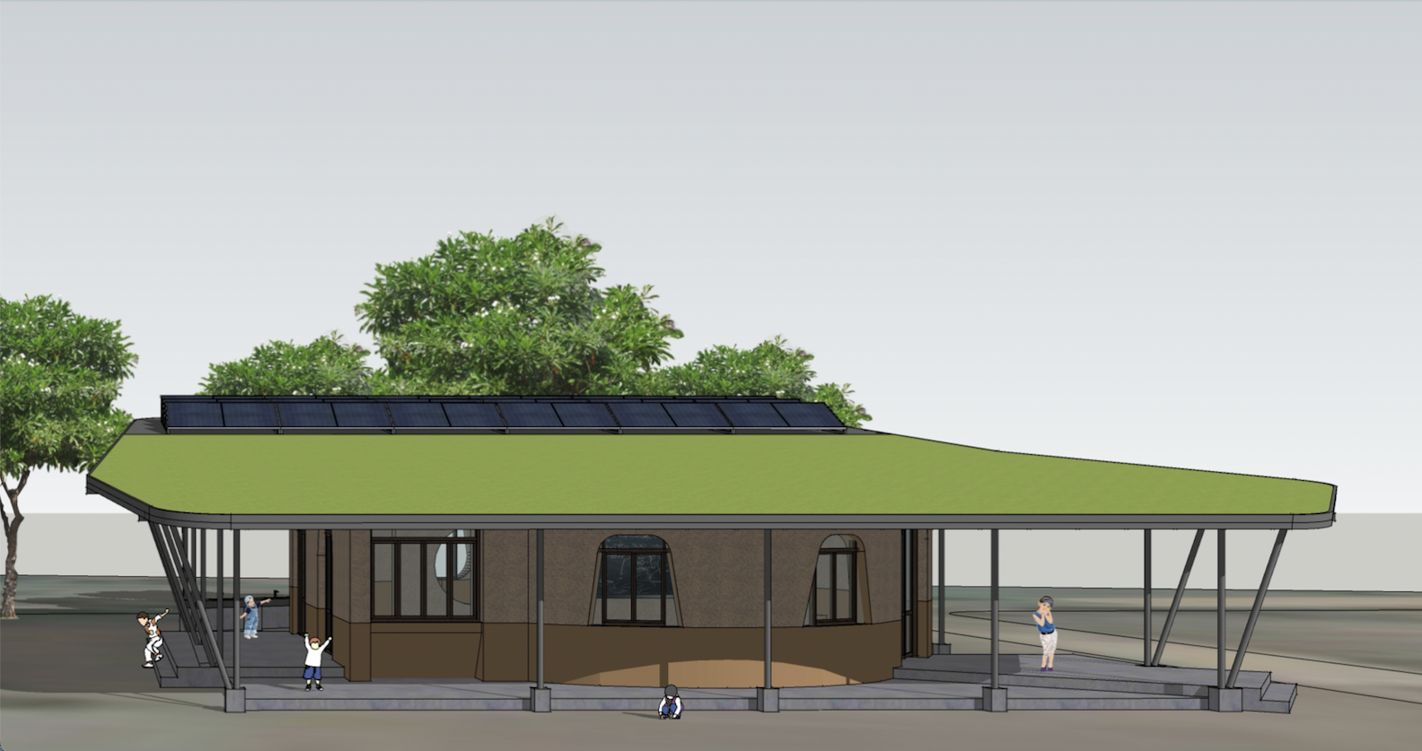Our architect friend from Vietnam, Trung Pham, designed the Green Building. The school will be constructed using earthen bags, adobe bricks, and recycled materials. A notable feature is the 'Green Roof' for passive cooling and 'Solar Panels' for electricity.