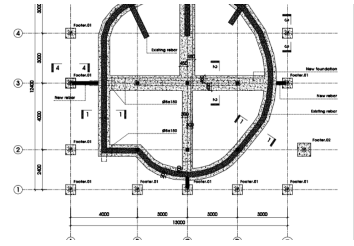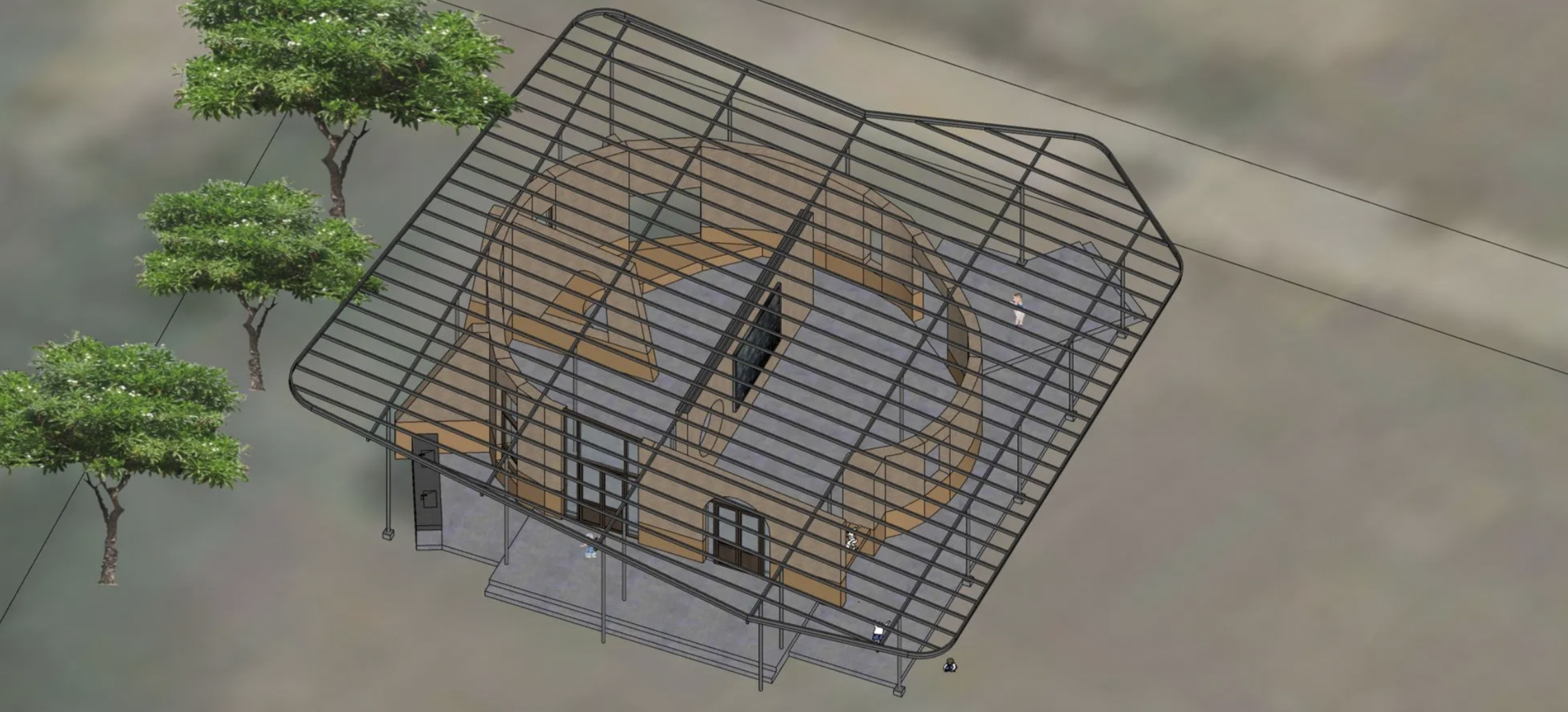 We've designed a wider foundation with several poles to hold the structure. A reinforced cross-shaped foundation connects the walls and poles, with additional exterior poles for roof support. The walls will bear some weight, and rebar mesh in the floor foundation ensures stability.