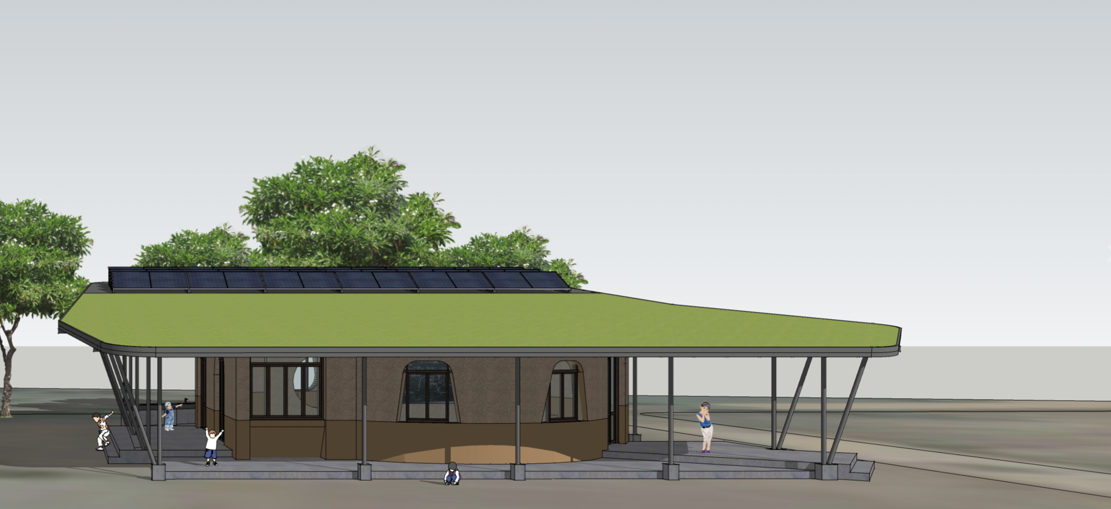 Our architect friend from Vietnam, Trung Pham, designed the Green Building. The school will be constructed using earthen bags, adobe bricks, and recycled materials. A notable feature is the 'Green Roof' for passive cooling and 'Solar Panels' for electricity.